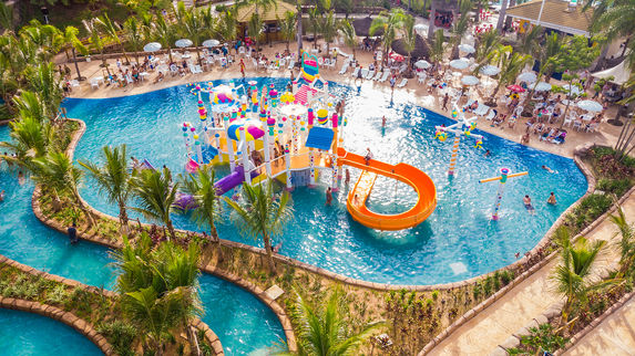 Execução do parque infantil com piscinas interativas, rio lento, instalação de brinquedos aquáticos interativos, construção do castelo de doces e construção das piscinas do parque da baleia.